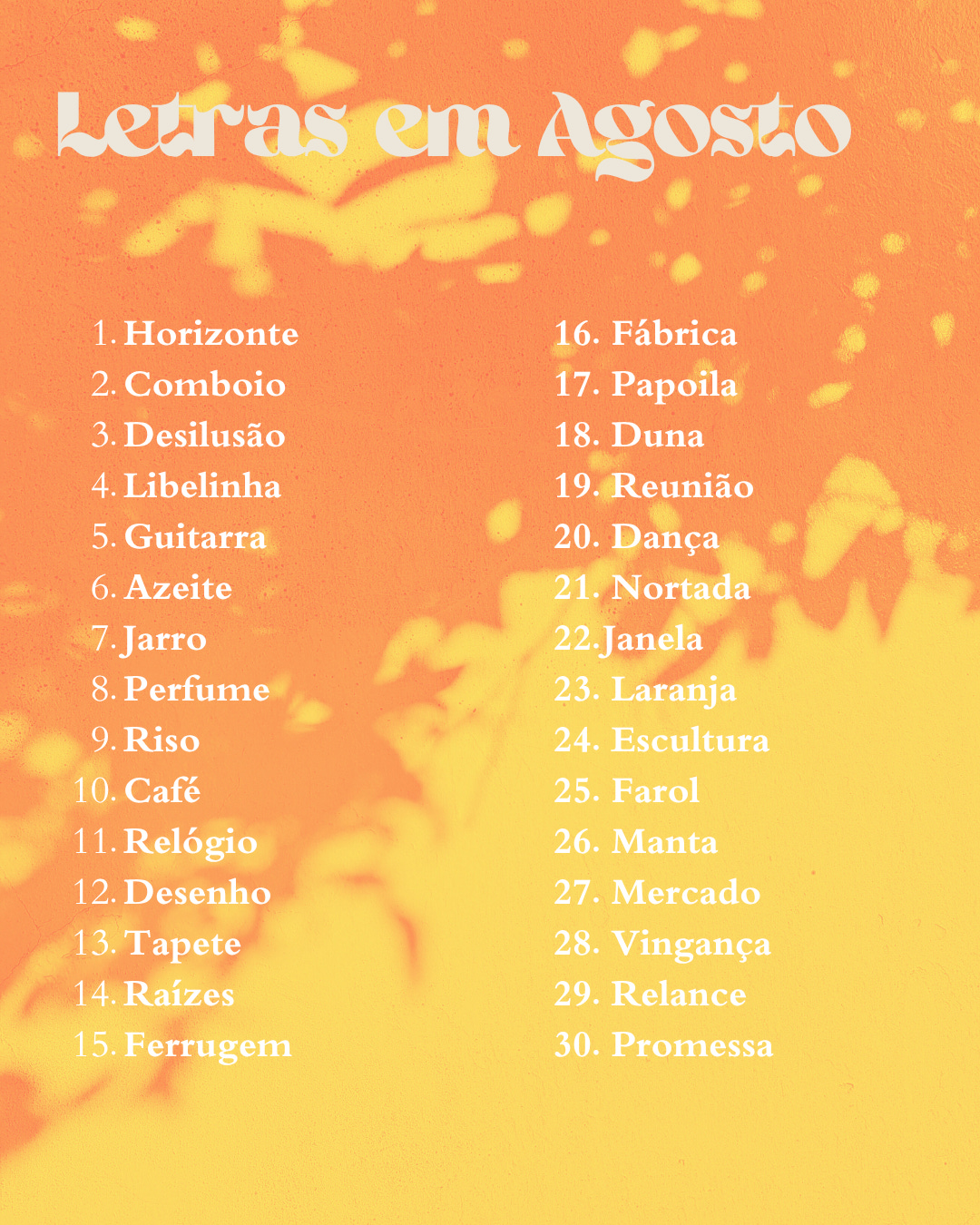 Letras Em Agosto é um mini-desafio de escrita que irei completar. Uma palavra ou prompt por dia, para prosa, poesia, journaling, cartas, cartazes, desenhos, mesmo para pesquisa. Sem limite mínimo ou máximo de palavras ou tempo dispensado.